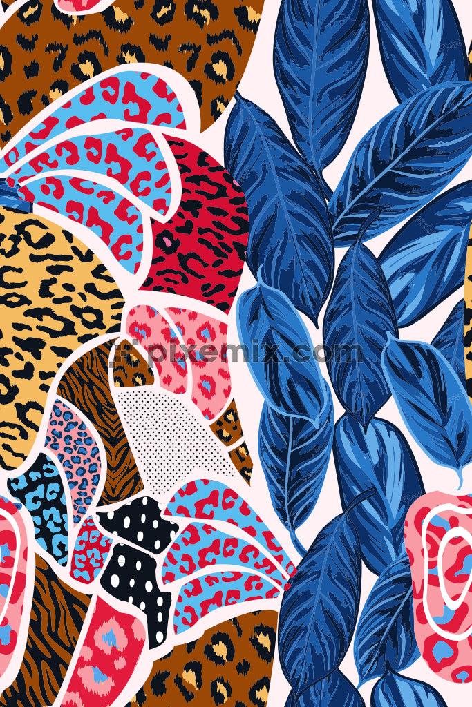Colorful mix & match animal skin art around leaves product graphic with seamless repeat pattern