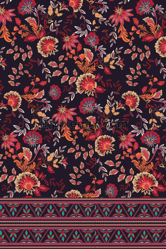 Chintz ethnic floral vector product graphic with seamless repeat pattern and border
