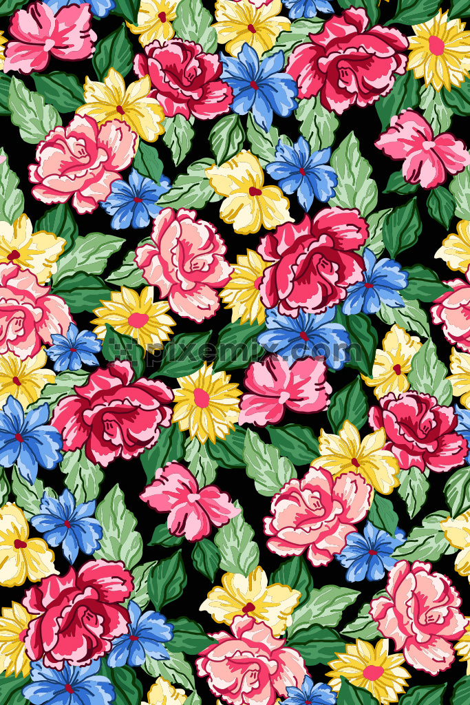 Mixed colourful florals and leaves art product graphic with seamless repeat pattern