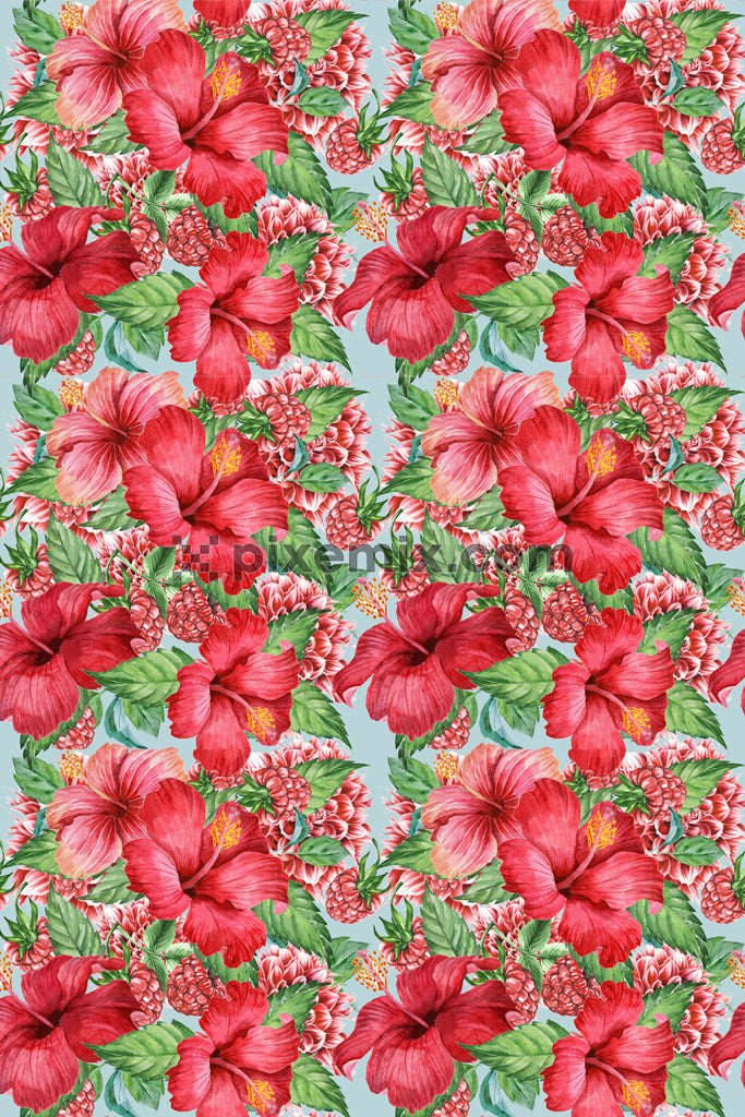 Hibiscus & raspberry product graphic with seamless repeat pattern