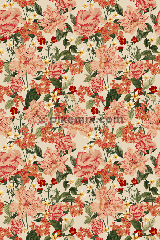 Orange botanical floral product graphic with seamless repeat pattern