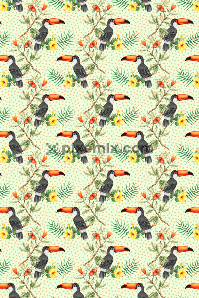Tropical toucan with tonal polka product graphic with seamless repeat pattern