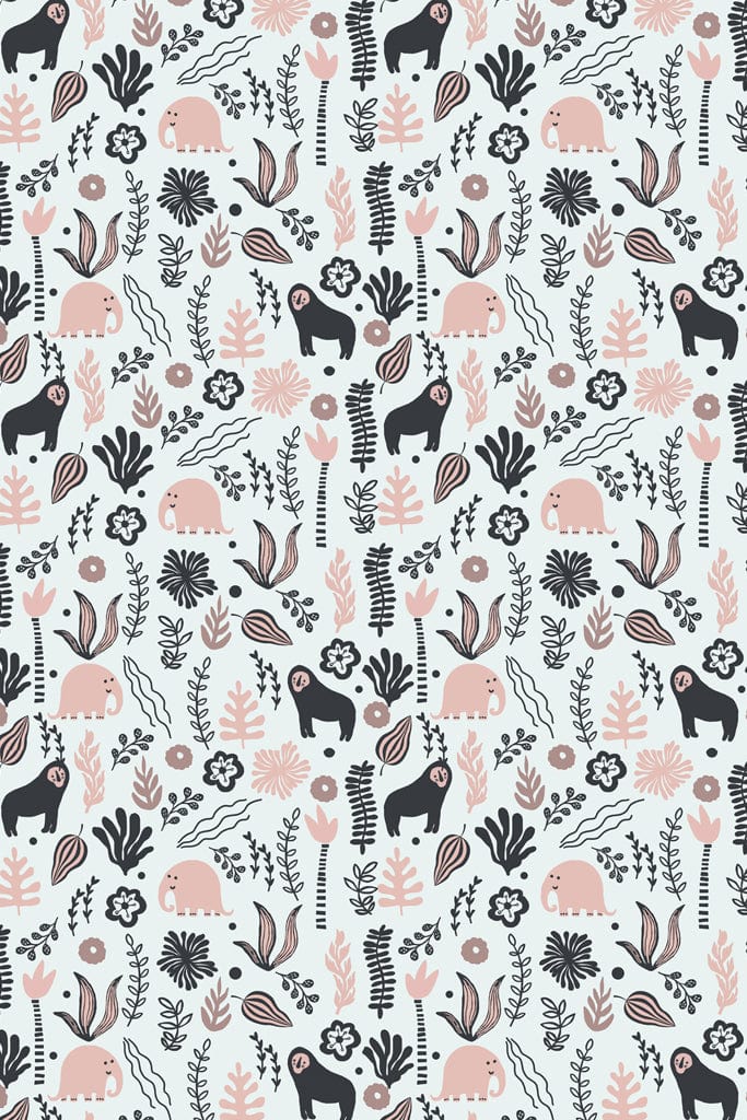 Cartoon animal and florals and leaves product graphic with seamless repeat pattern