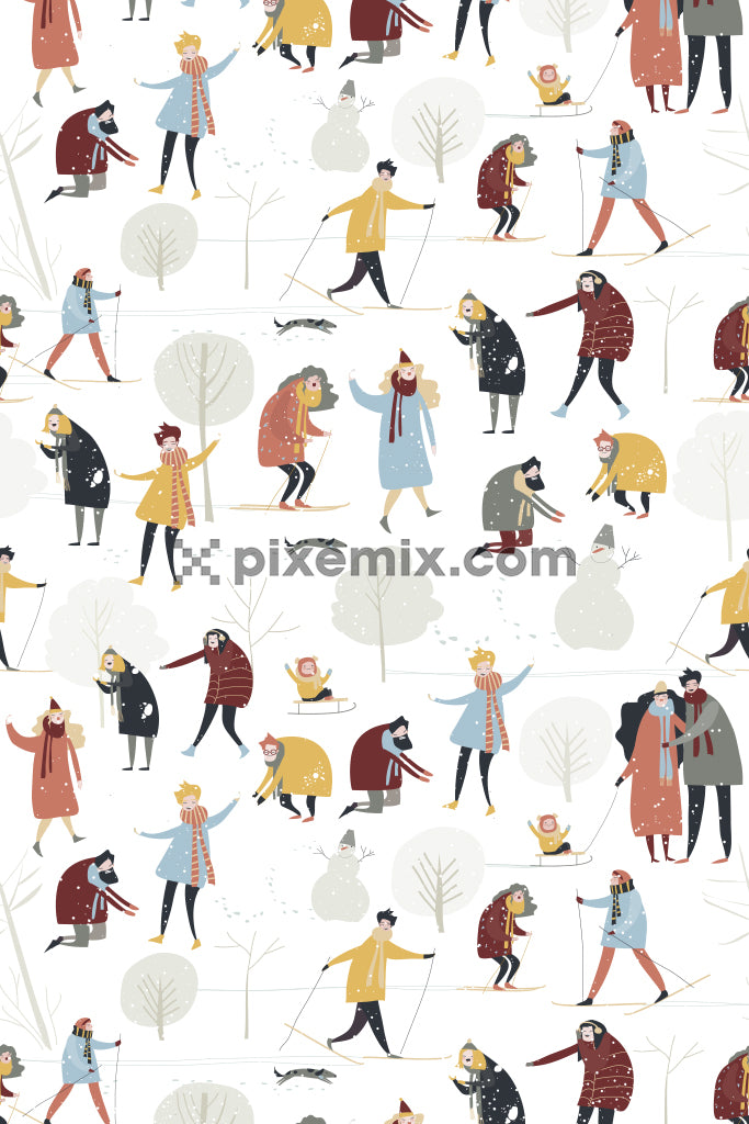 Cartoon human and snow product graphic with seamless repeat pattern