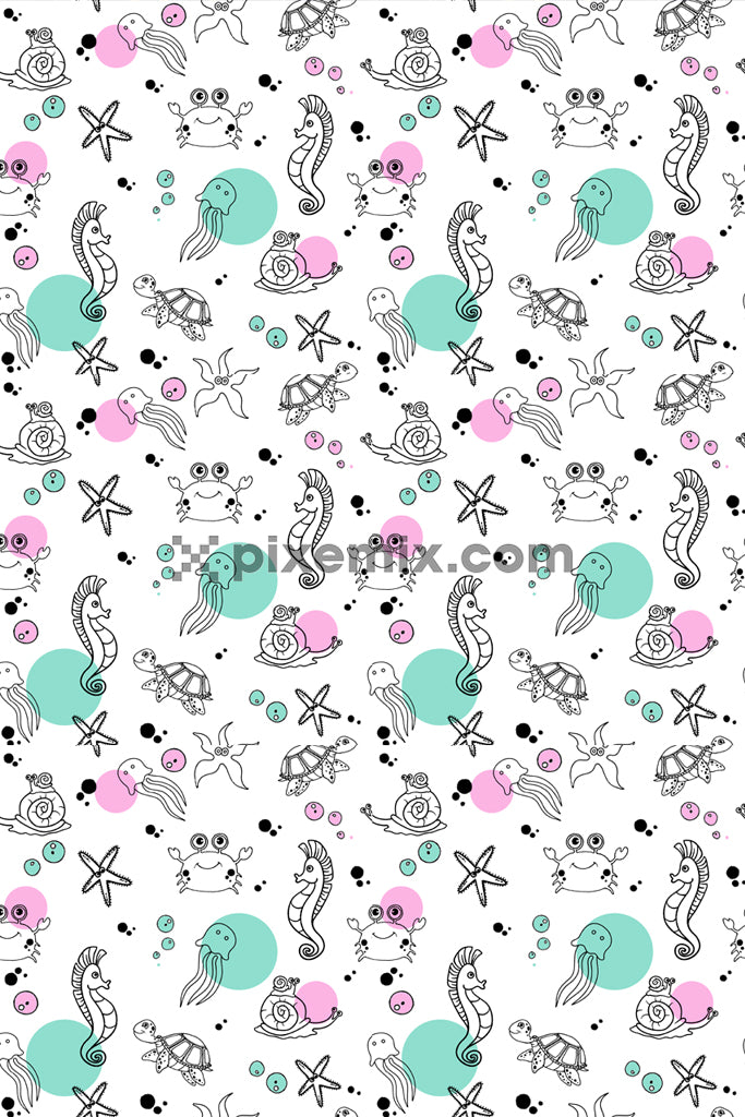 Cute sea creatures doodle product graphic with seamless repeat pattern