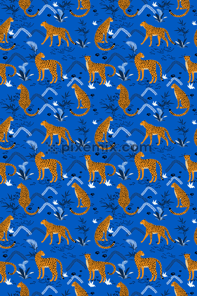 Jungle doodle art around cheetah product graphic with seamless repeat pattern