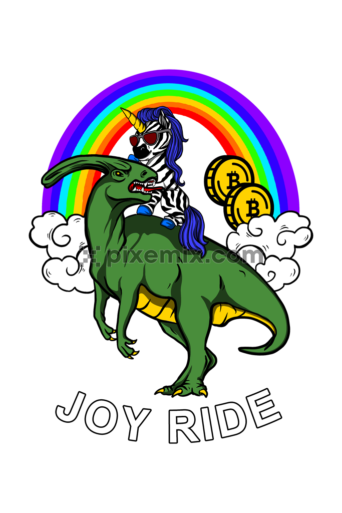 Cartoon unicorn joy ride with Bitcoin product graphic