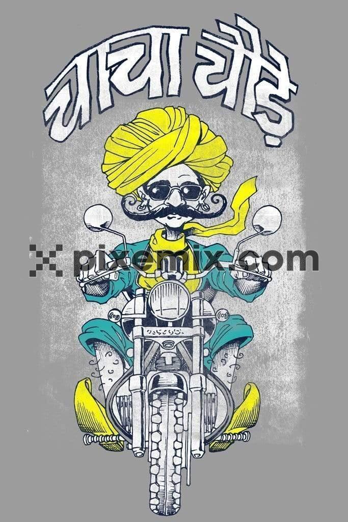 Indian desi man riding motorcycle product graphic with hindi typography