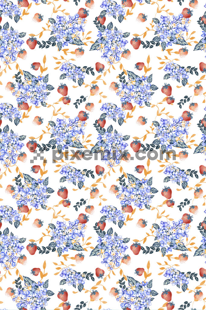 Botanical pattern with blue hydrangeas, strawberries, and foliage in a soft watercolor style.