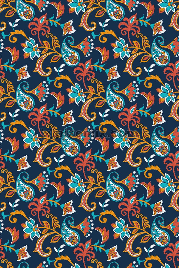 Ikat-art inspired paisley around kalamkari floral product graphic with seamless repeat pattern.