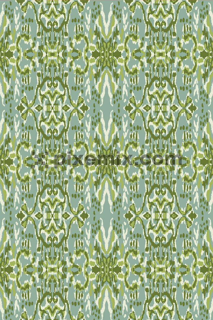Seamless green abstract ikat pattern with tribal motifs and hand-drawn textured artistic background.
