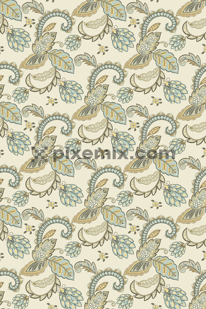 Elegant vintage floral paisley pattern in muted blue, green, and gold on a cream background.