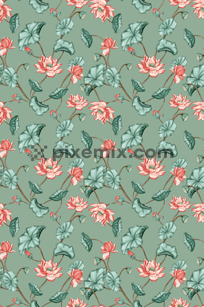 Elegant botanical-art inspired seamless lotus flower pattern with green leaves on green background.