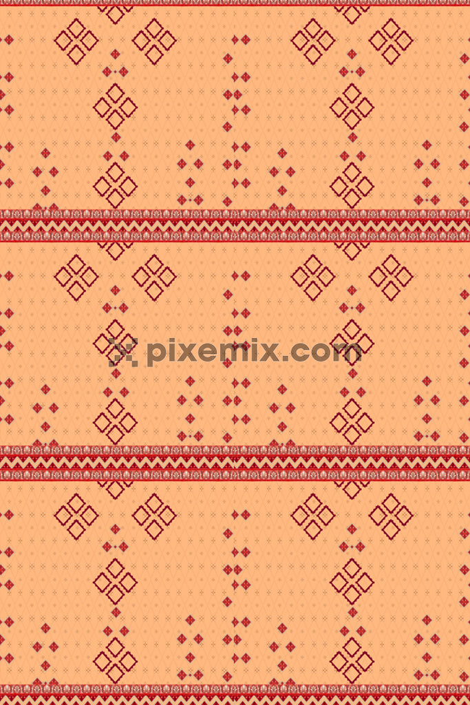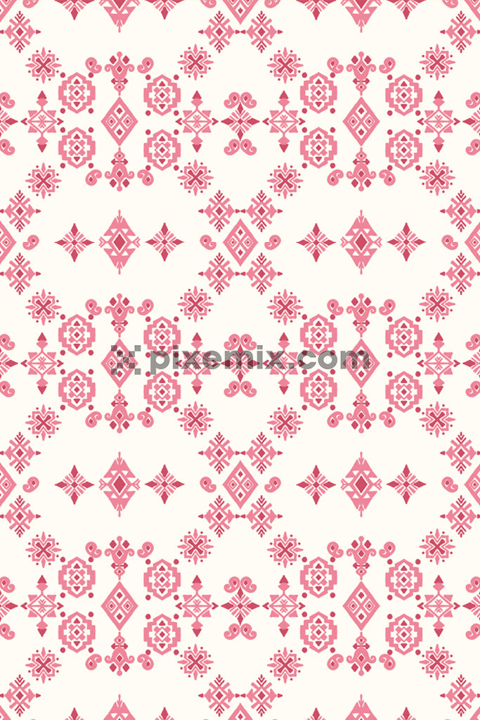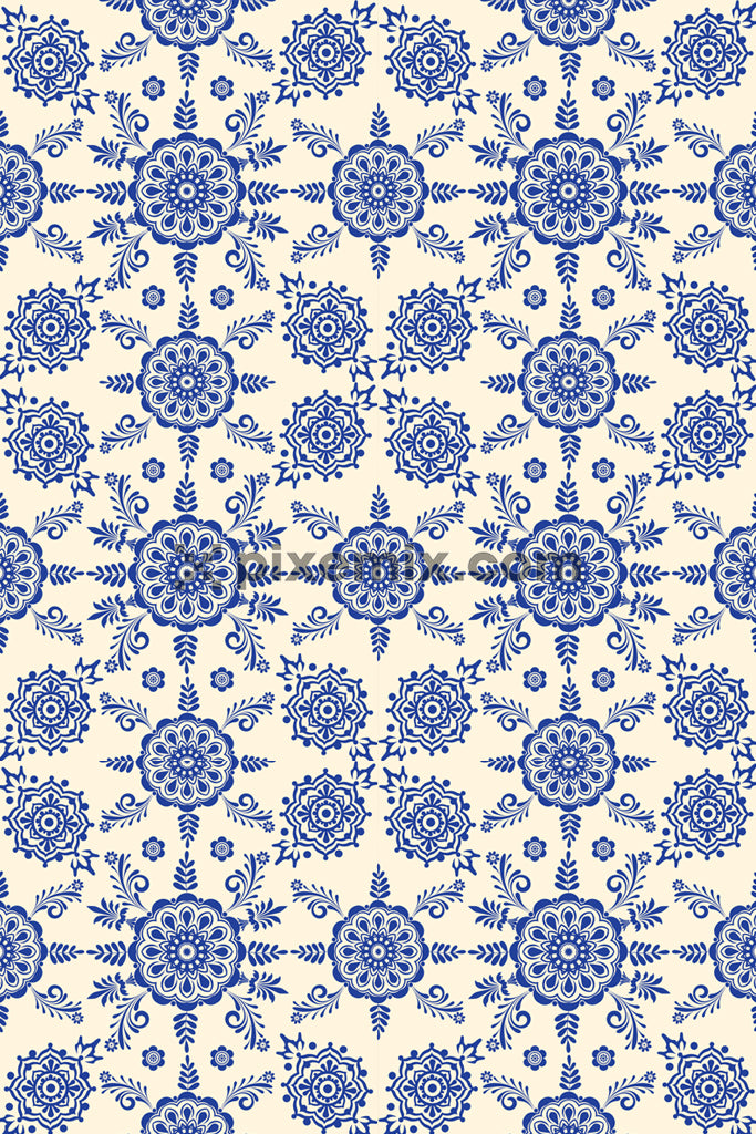 A hand drawn digital illustration of traditional block print designs in a seamless repeating pattern