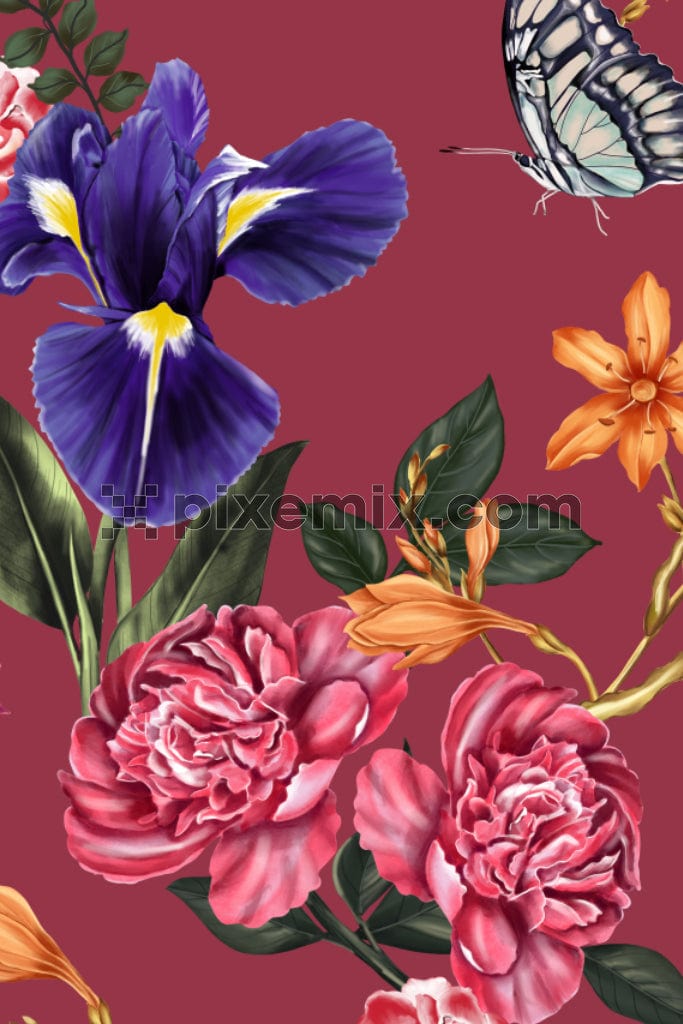 Digital illustration of flowers and insects product graphic with seamless repeat pattern