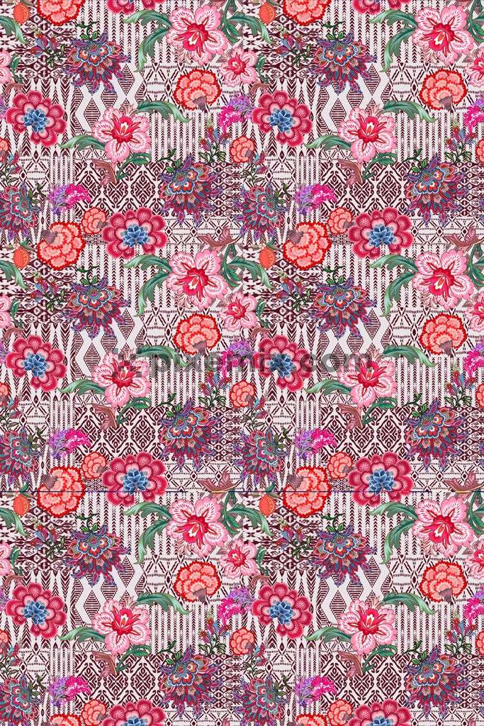 Ikkat art inspired florals and leaves product graphic with seamless repeat pattern