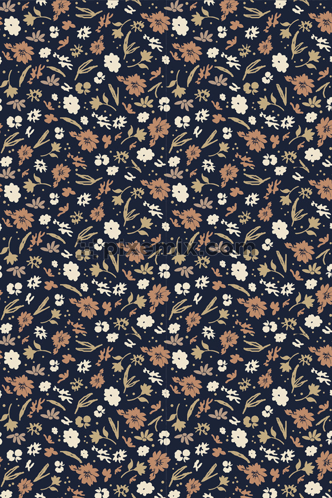Doodle art-inspired florals and leaf product graphic with seamless repeat pattern