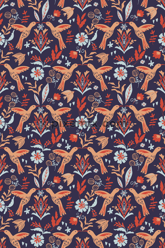 Doodle florals and birds product graphic with seamless repeat pattern