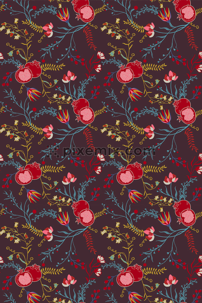 Doodle florals and fruits product graphic with seamless repeat pattern