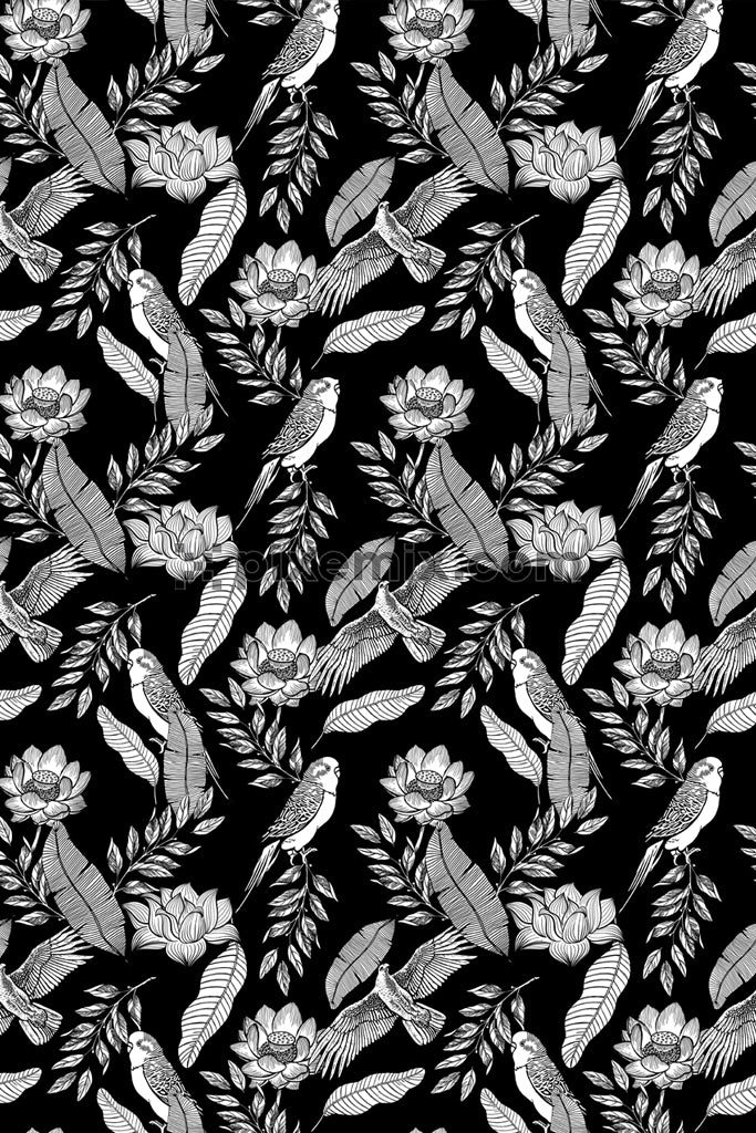 Beautiful black & white lineart of birds & florals product graphic with seamless repeat pattern