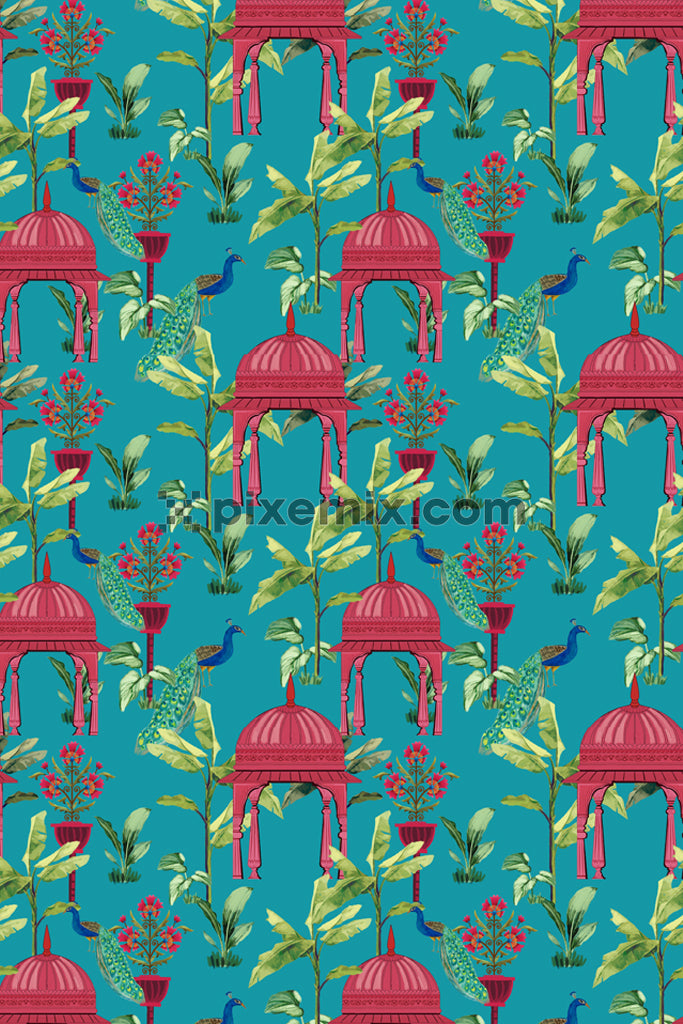 Mughal art inspired peacock and banana tree product graphic with seamless repeat pattern