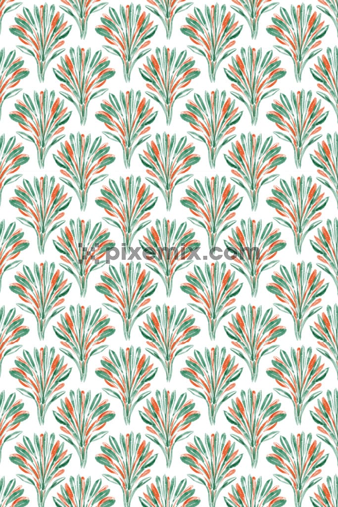 A repeating botanical pattern with stylized foliage motifs in shades of green and orange on a white background.