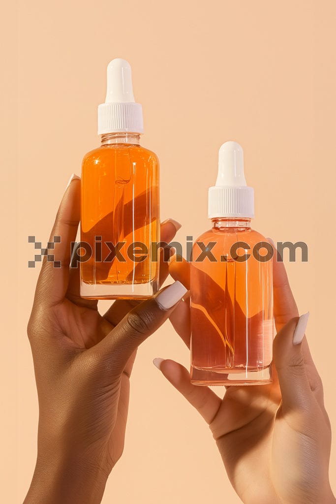 Two woman hands holding glass serum bottle on beige background image.
