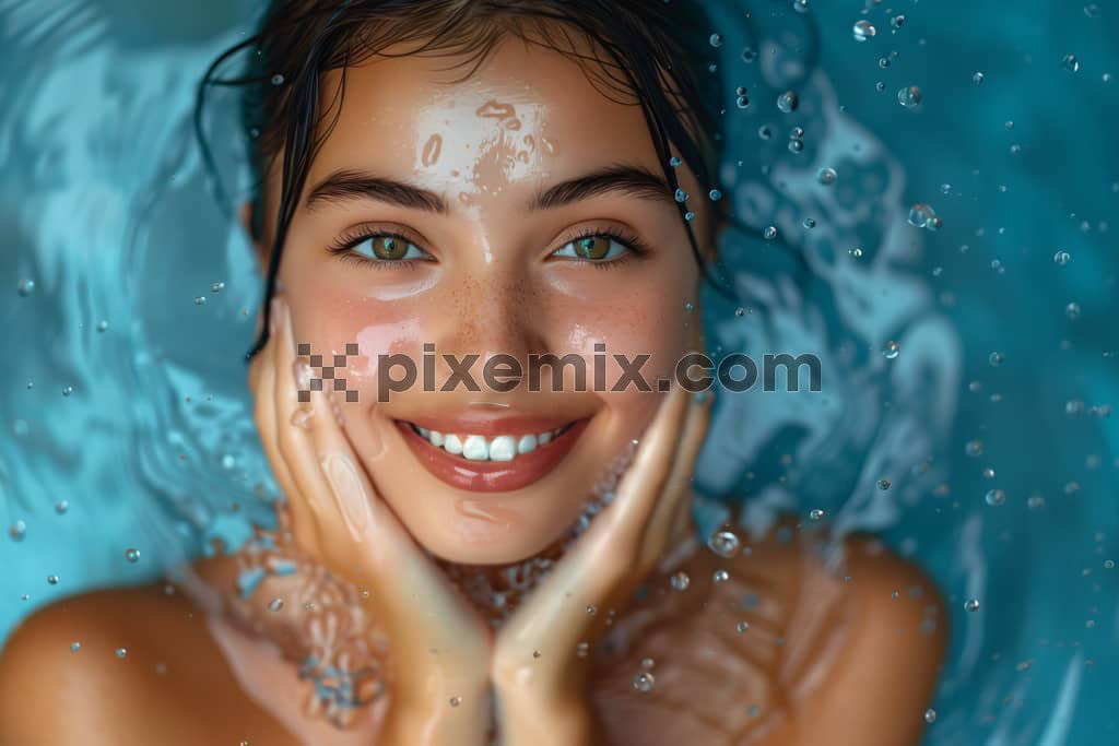 Beautiful portrait of a women in a swimming pool looking at the camera from a top angle.