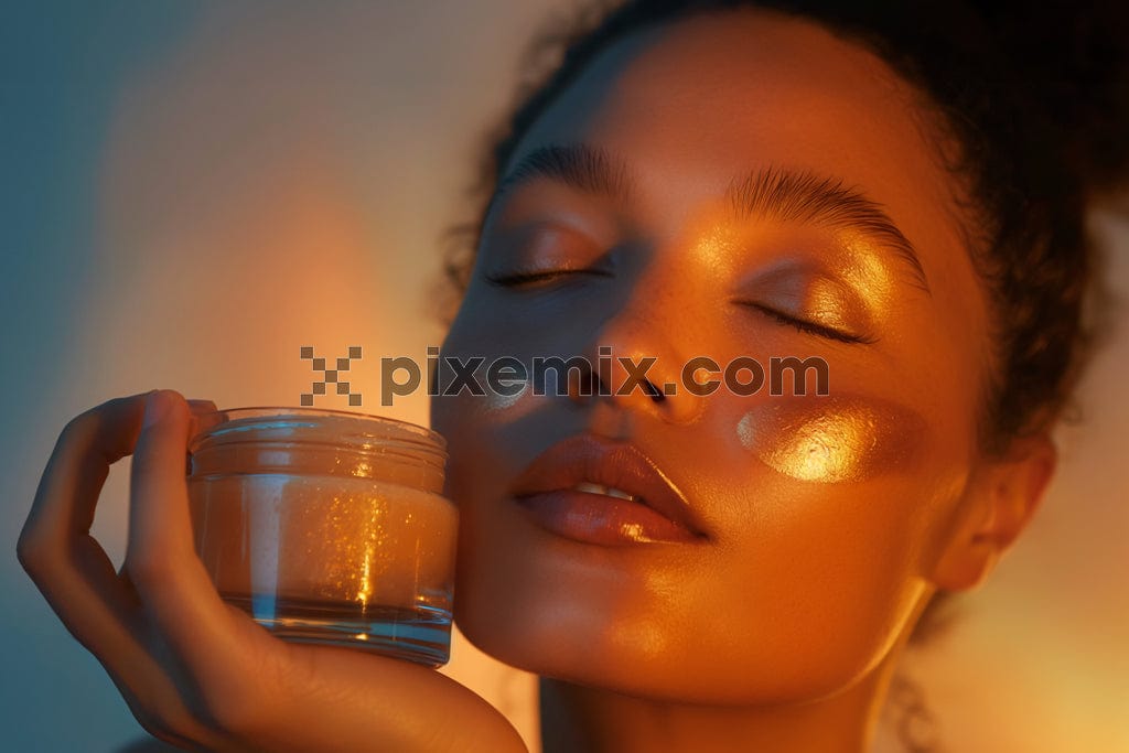 The image shows a beautiful woman holding a transparent glass jar of cream.