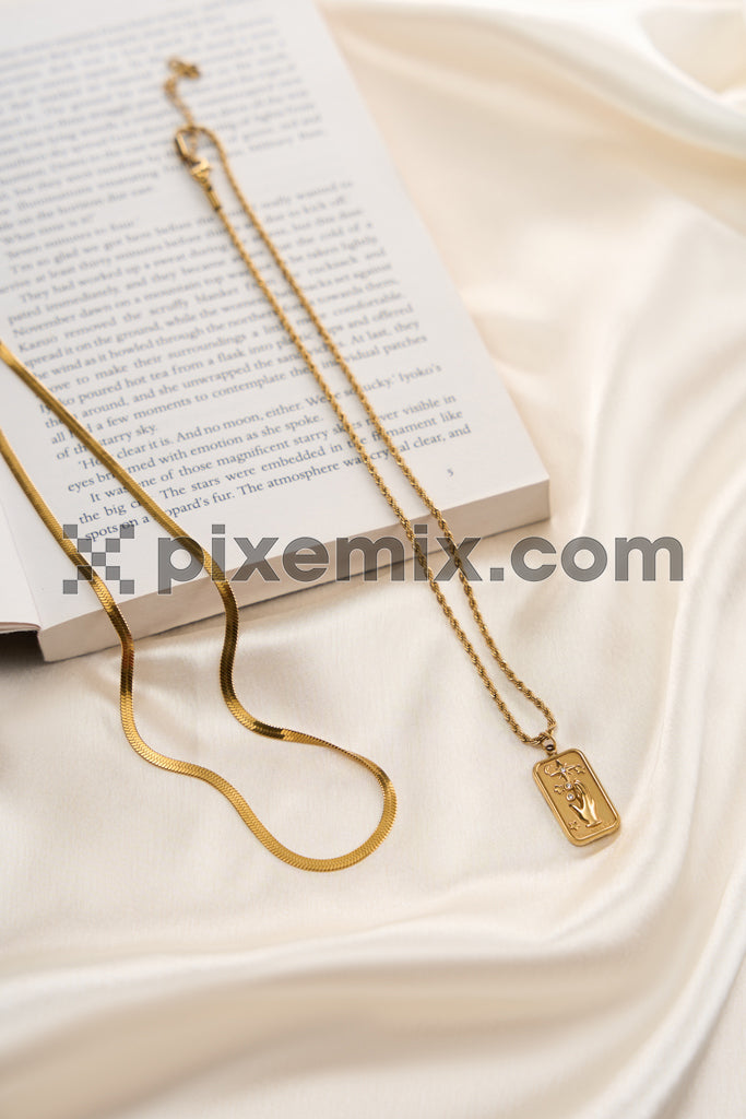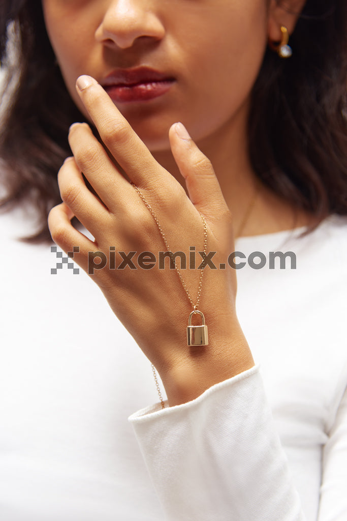 Close-up of woman showcasing elegant gold lock pendant necklace with minimal white outfit.