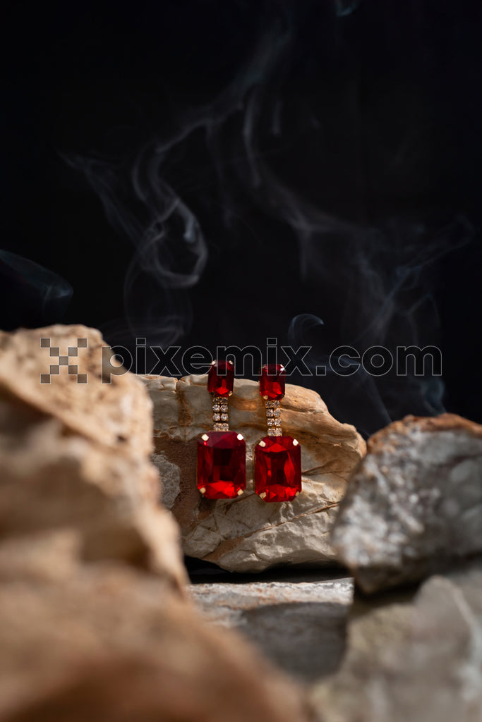 Elegant gold and diamond earrings with red gemstone on silk fabric in luxury jewelry close-up.