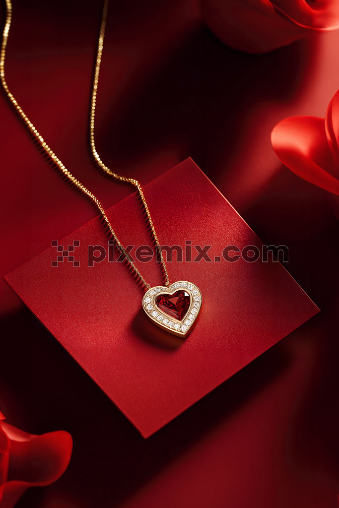 Heart-shaped ruby pendant necklace on red background with roses stock image.