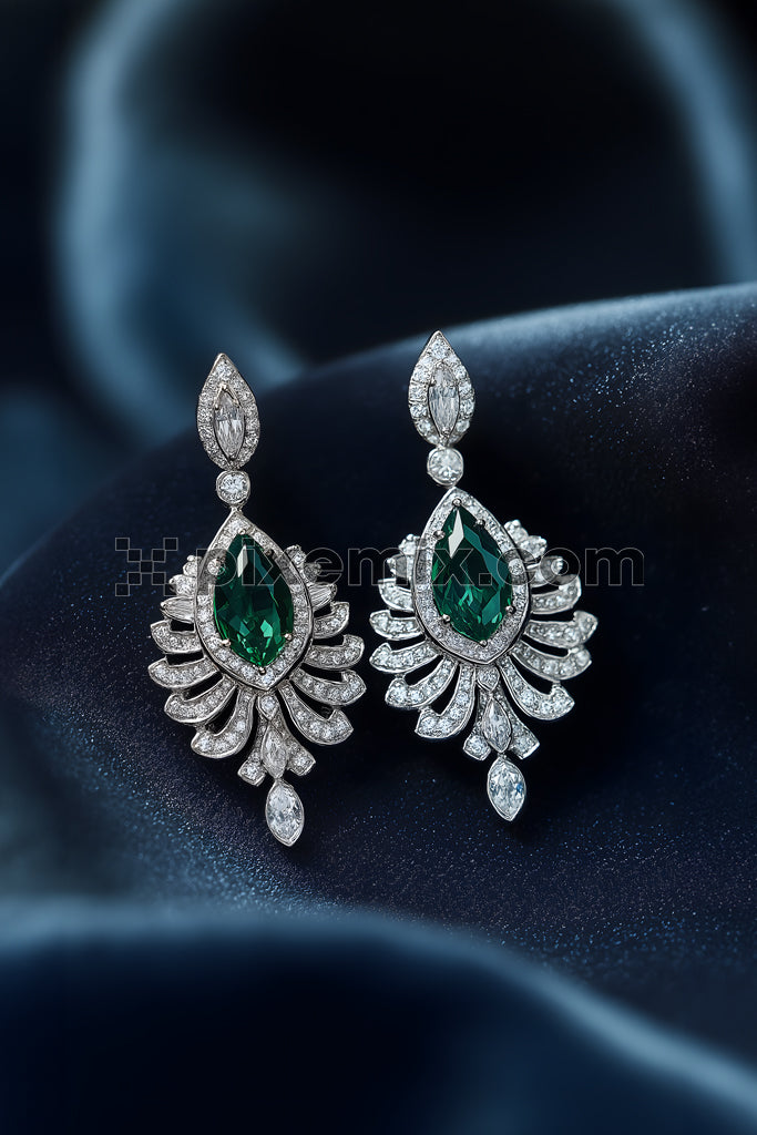 Elegant emerald and diamond chandelier earrings displayed on dark blue velvet fabric for luxury presentation.