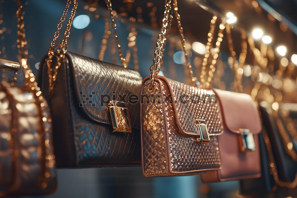 Luxury handbags with golden chains displayed in boutique, showcasing elegant fashion accessories.