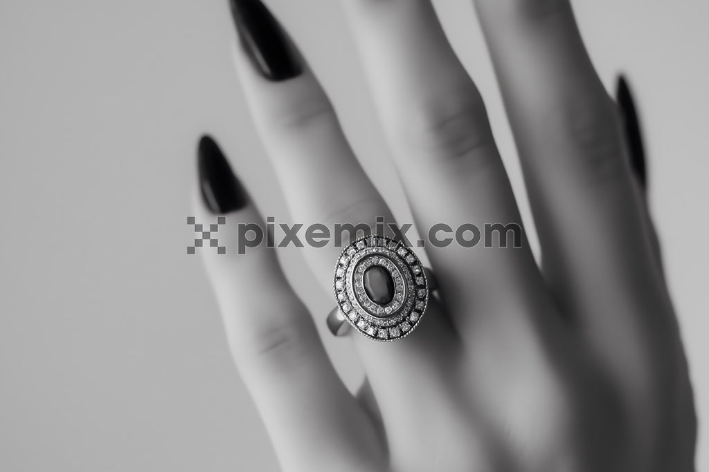 Black and white close-up of hand wearing elegant gemstone ring with dark nails and soft lighting.