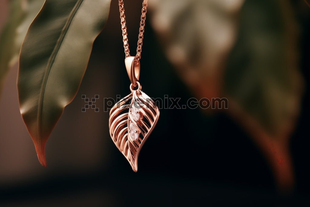 Elegant gold leaf pendant necklace with diamonds displayed against a natural, blurred foliage background.
