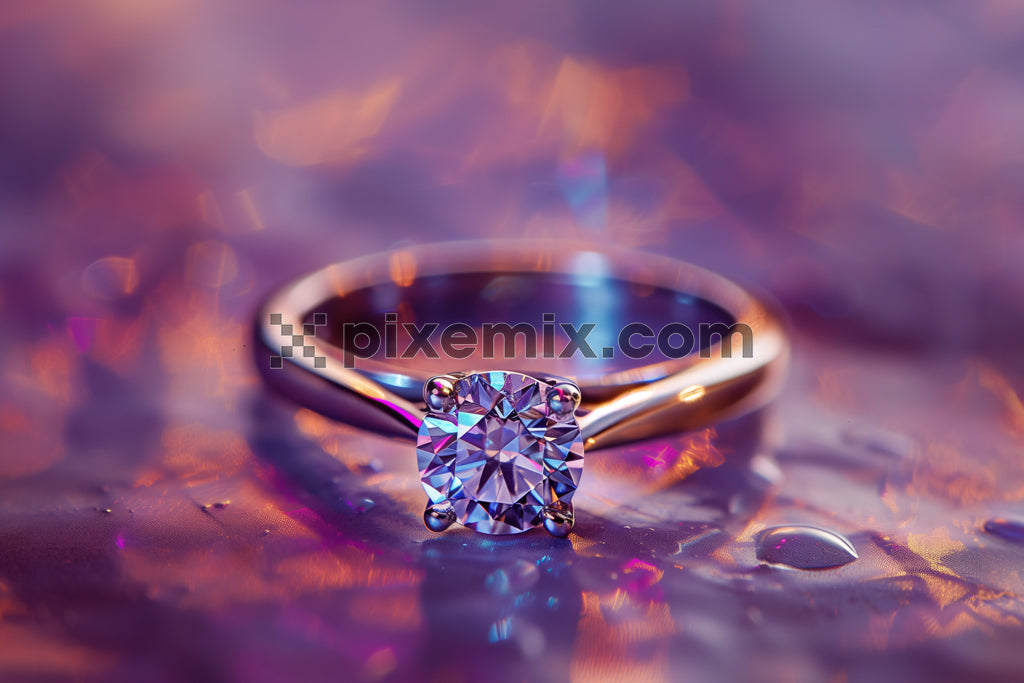 Elegant solitaire diamond engagement ring with romantic purple bokeh background.