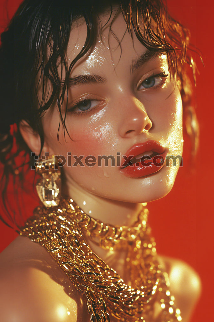 Glamorous close-up portrait of a woman with wet look makeup and bold gold accessories.
