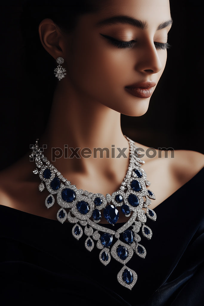 Elegant woman wearing luxurious diamond and sapphire necklace set stock image.