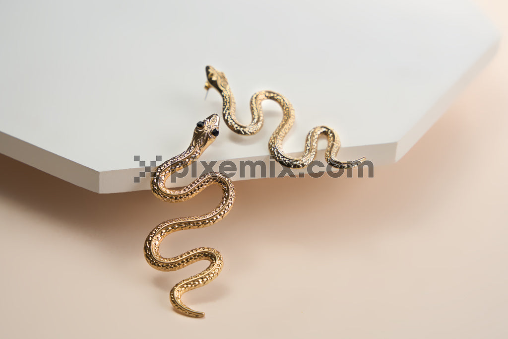 Elegant gold snake earrings with black gemstone eyes displayed on minimalist neutral-toned geometric platform.