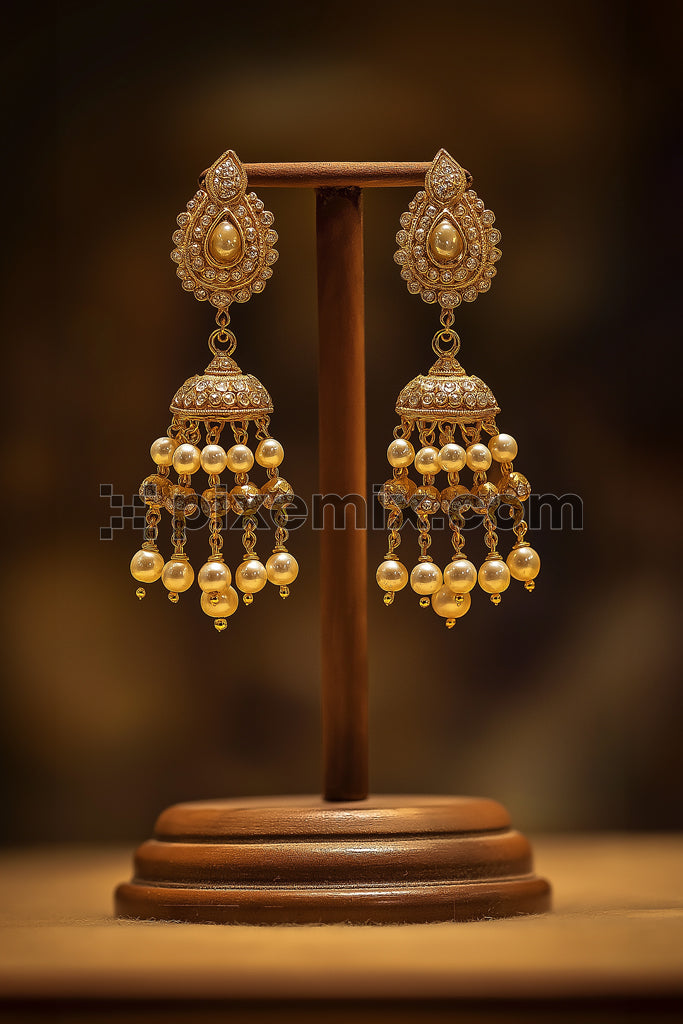 Elegant gold jhumka earrings with pearls displayed on wooden stand against warm blurred background.