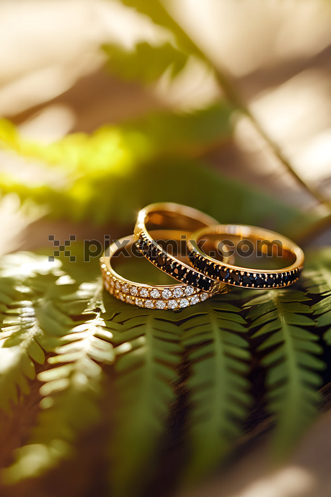 Elegant gold and diamond rings displayed on lush green fern leaves stock image.