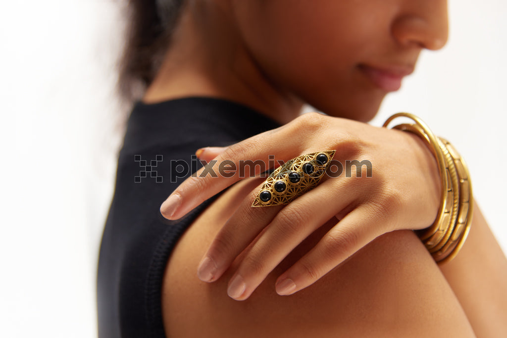 Close-up of woman wearing intricate gold ring and bangles showcasing elegant ethnic jewelry stock image.