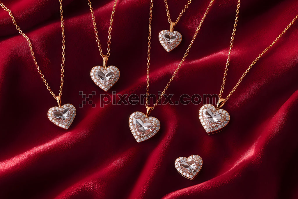 Elegant heart-shaped diamond pendants on gold chains displayed on rich red silk background.