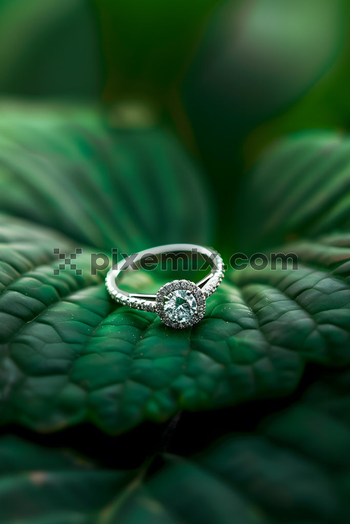 Elegant diamond engagement ring displayed on lush green leaves in natural outdoor setting.