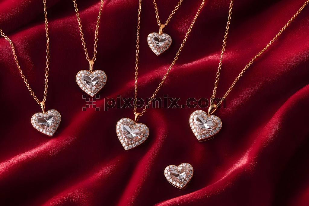 Elegant heart-shaped diamond pendants on gold chains displayed on rich red silk background.