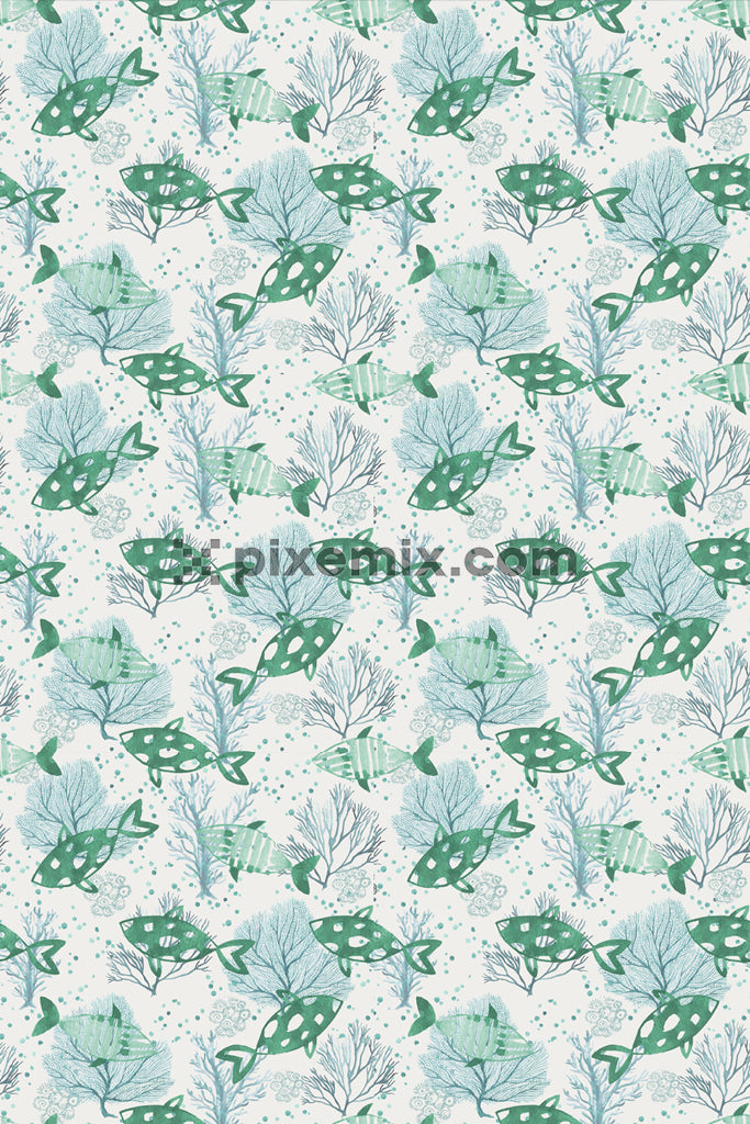 Doodleart inspired fish and under water plants product graphic with seamless repeat pattern