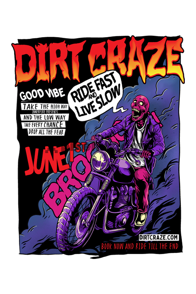 A hand drawn product graphic featuring a rider riding along with typography and texture