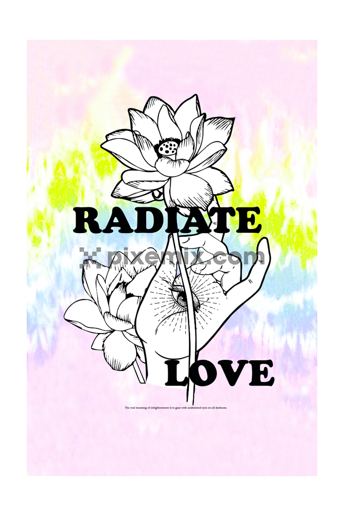 Lord Buddha's hand with eye holding Lotus flower art product graphic with tie-dye background