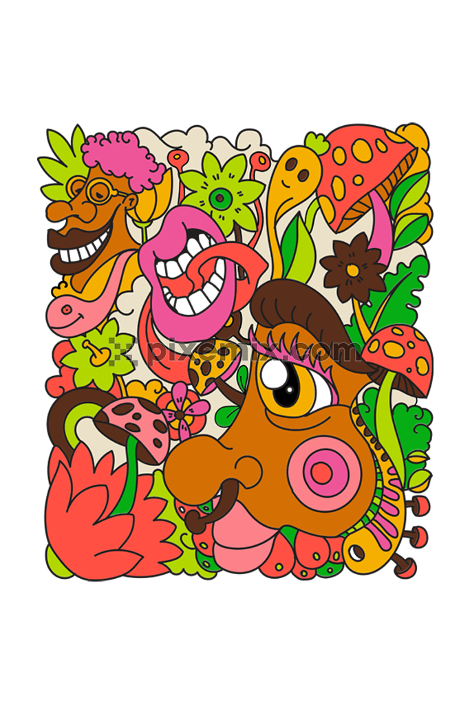 Popart inspired cartoon human face and mushroom product graphic